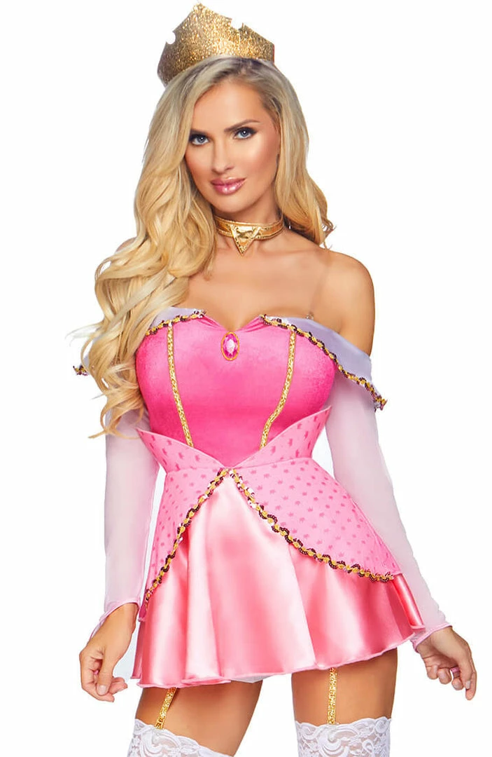 Sexy Princess costume featuring a short baby pink romper dress with glitter and sequins, long transparent sleeves, gold choker and a matching Princess crown.