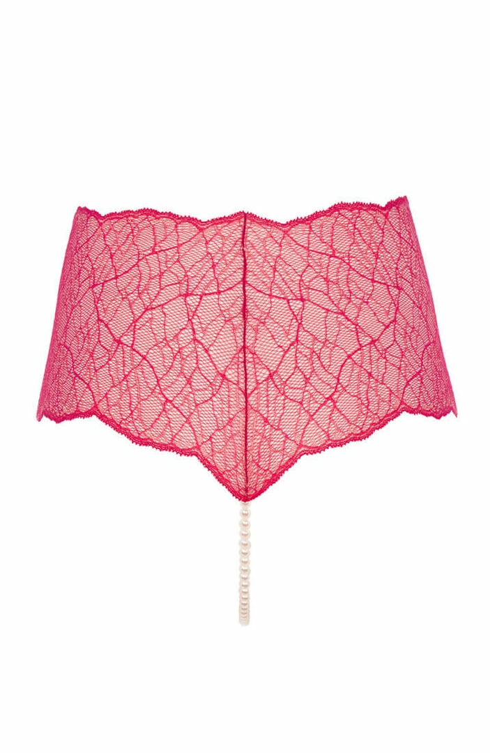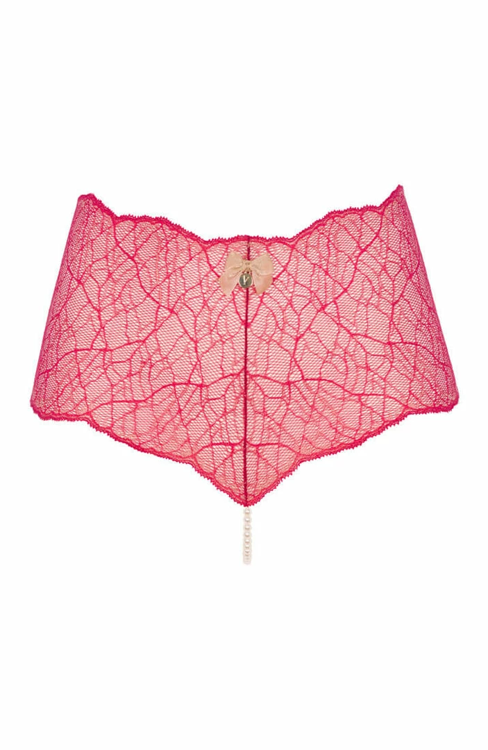 This hipster panty is made from an exclusive Italian red lace with gold lurex highlights and has the iconic white stimulating Manacor pearl string.