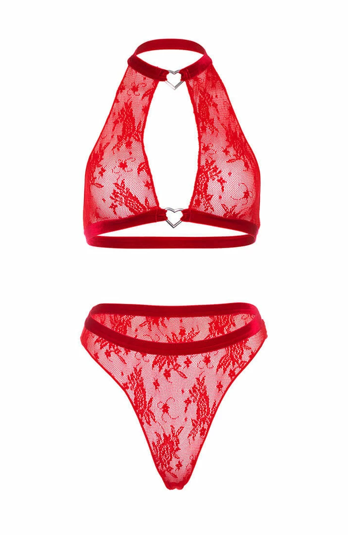 Red lace lingerie set featuring a halterneck bralette top with a red velvet trim and delicate silver hearts at the front with a matching high waist g-string thong.