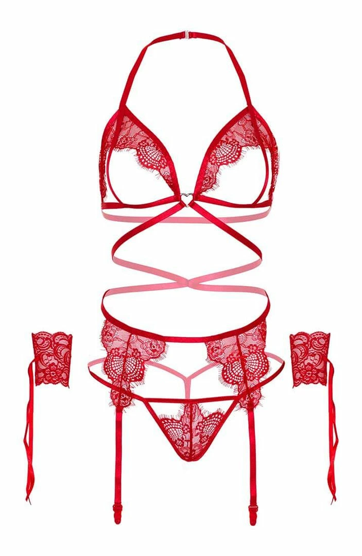 Long for the naughtiest encounter in this seductive red lingerie set featuring an open cup bra with a feminine scalloped eyelash lace, a unique strappy design, matching high waist garter belt, a strappy g-string panty and ribbon tie restraint cuffs.