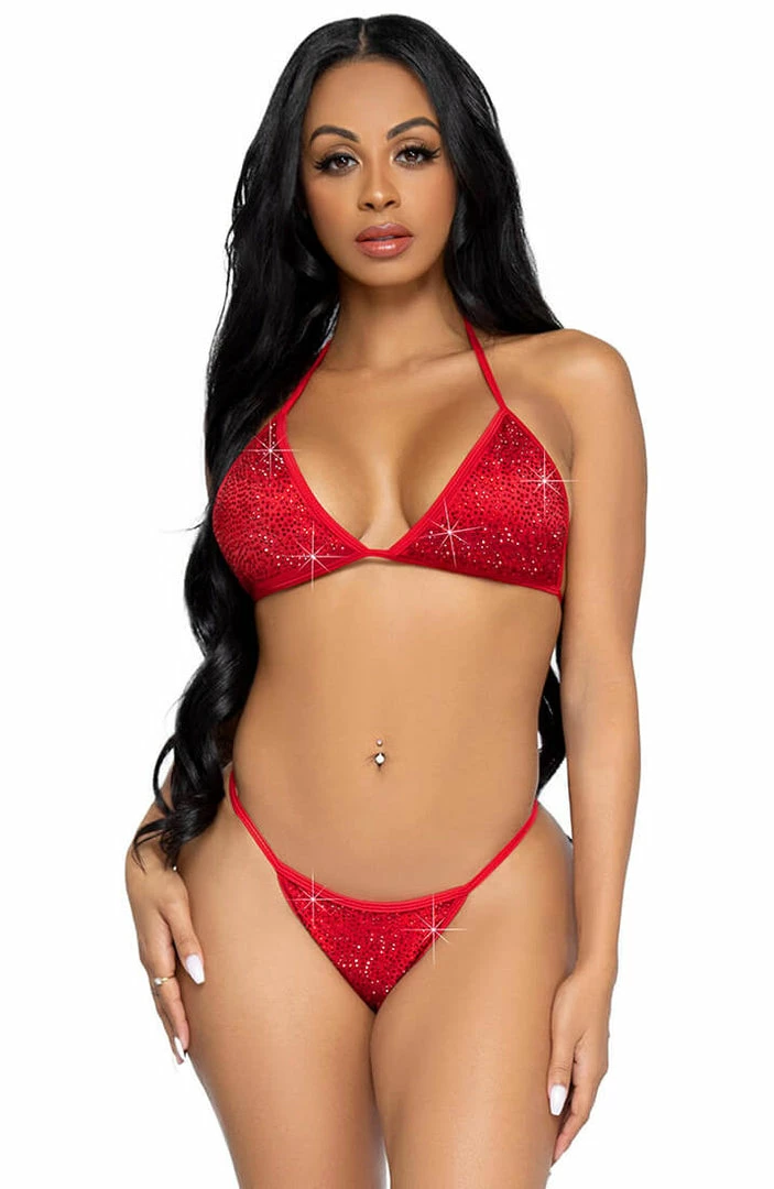 This red bikini set features a hot AB rhinestone triangle bikini top with adjustable tie back straps for a customized fit and a cheeky ruched bikini bottom.