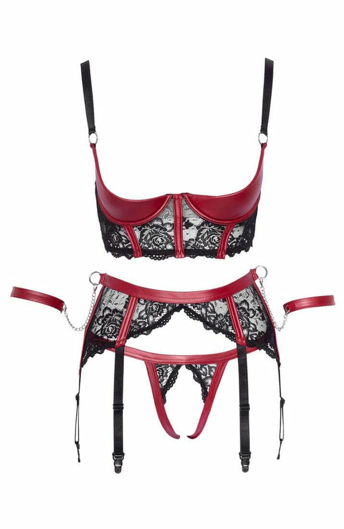 Your night will take a steamy turn in this sultry bondage lingerie set featuring a shelf bustier bra with black lace and red wet look panelling, matching garter belt with restraints and bondage chains, adjustable suspenders and a crotchless string panty.