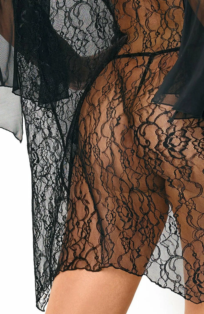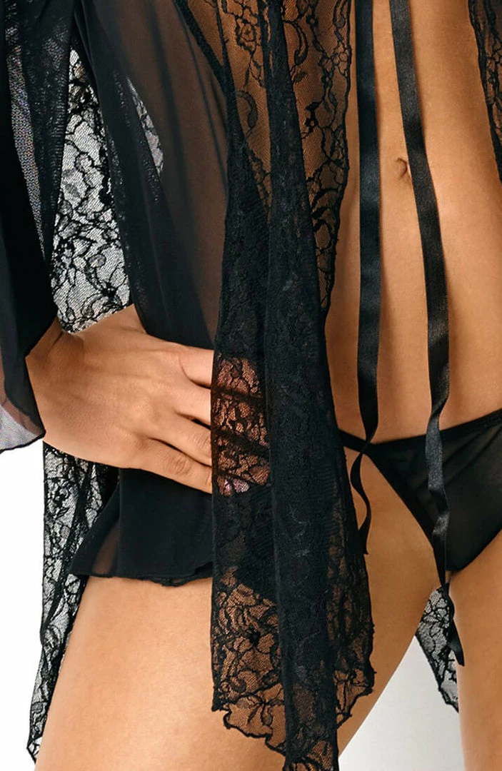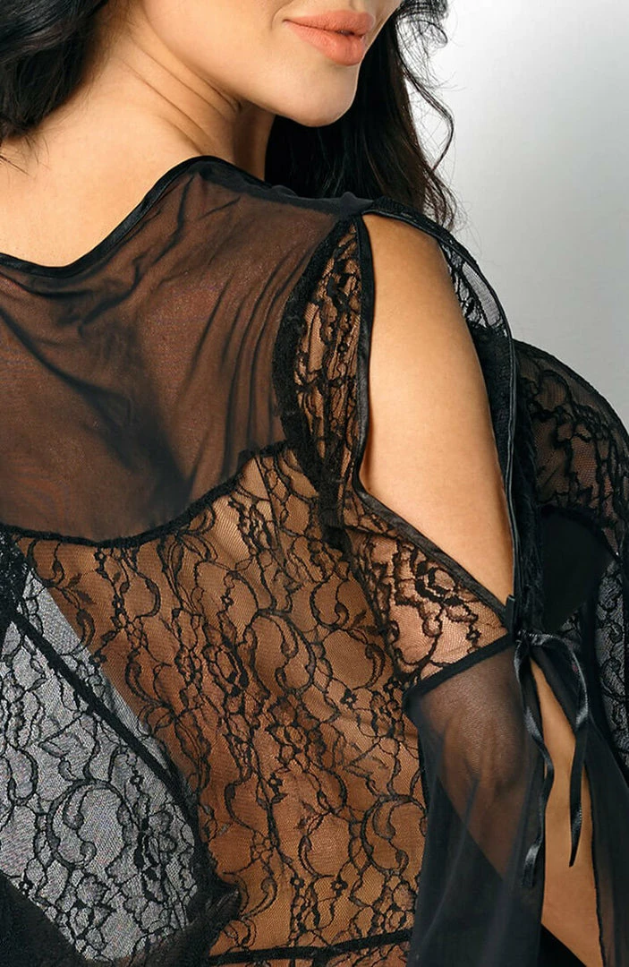 Black lace robe made from light and airy materials with cut-out sleeves and a delicate black satin ribbon to tie at the front.