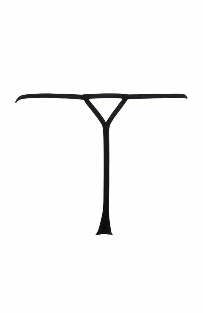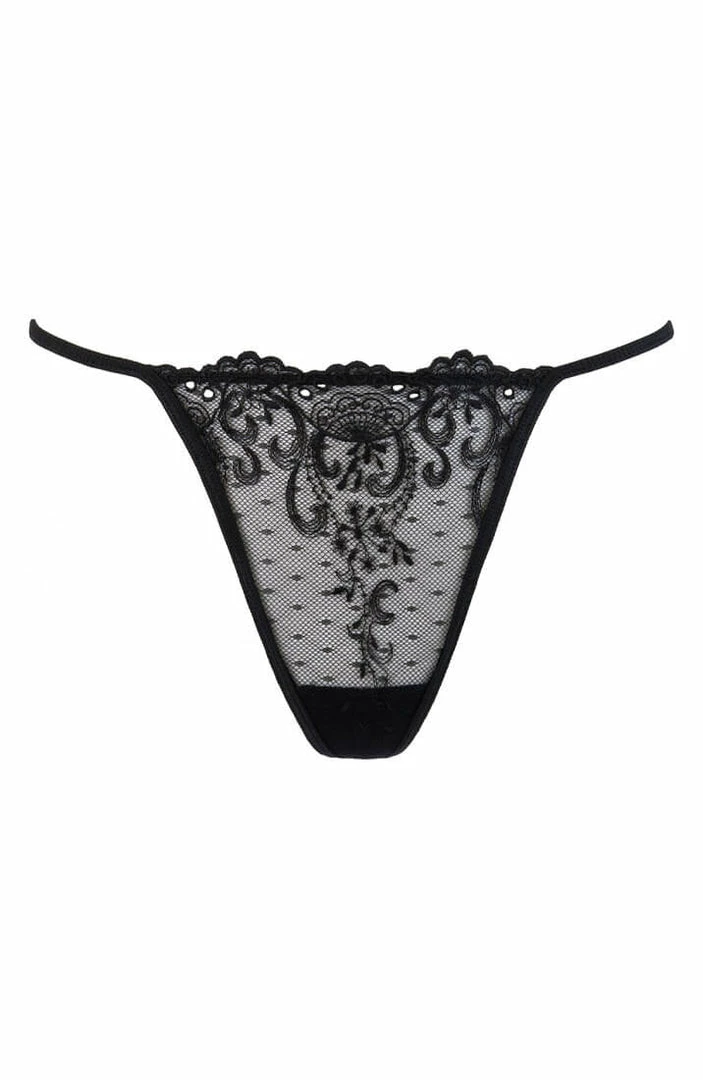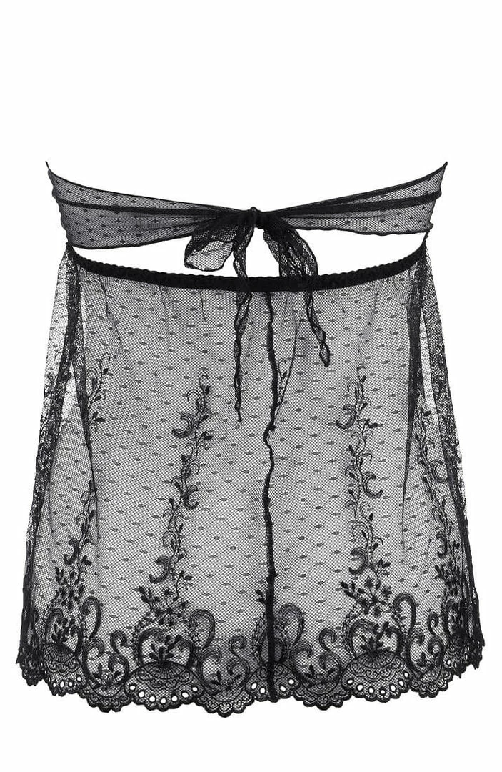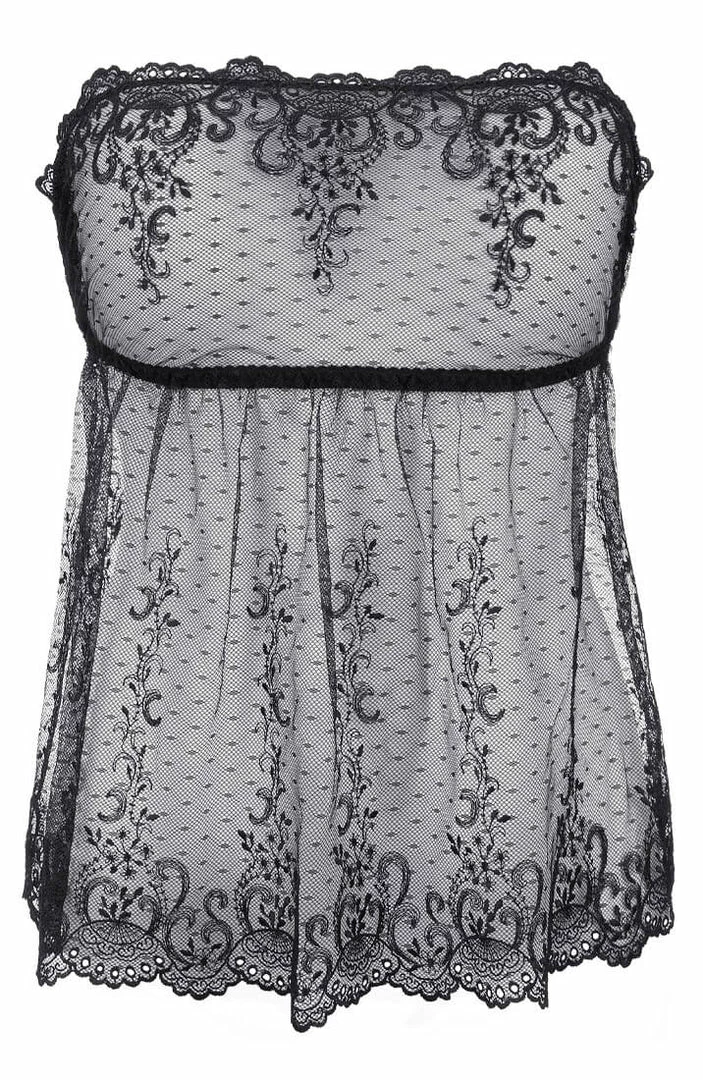 Persuade your honey to stay in bed for the night in this alluring black babydoll set featuring a strapless and flowy design, transparent lace with embroidered pattern, an elastic underbust line, bow-tie back closure and a matching string panty.