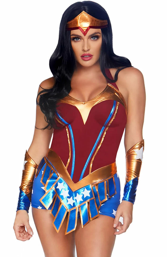 Save a hot stud or two in this amazing super-heroine costume featuring a dark burgundy body romper with a blue and white star booty shorts bottom. Metallic gold and blue accents, a metallic gold v-neck and matching gold headpiece and wrist cuffs.