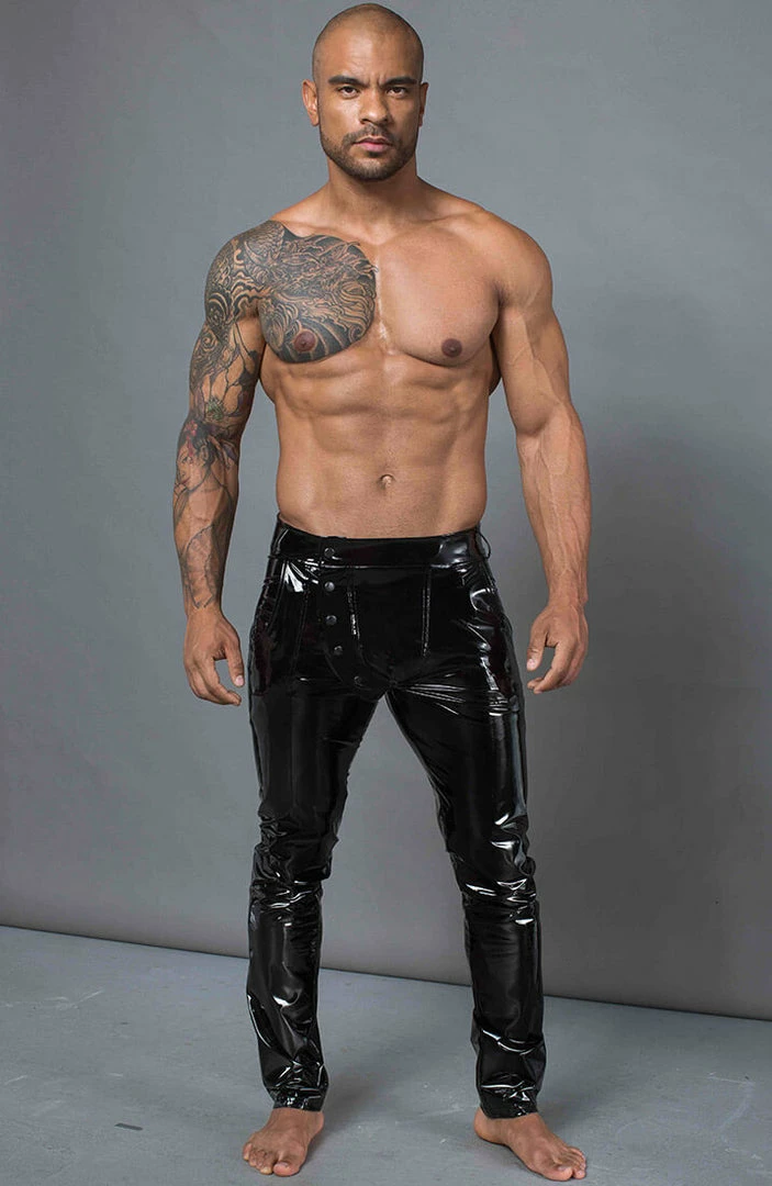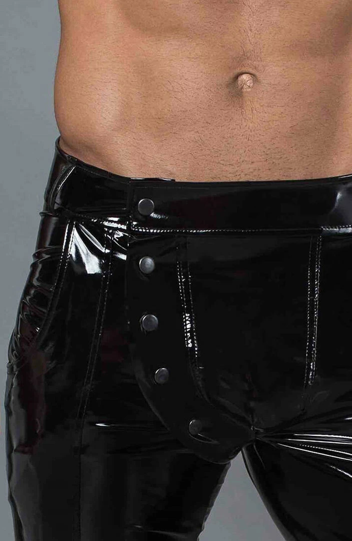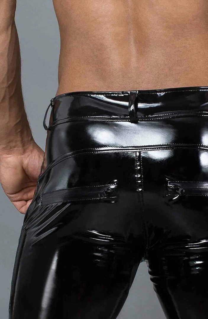 Black PVC pants with push buttons at the front and back pockets with zips.