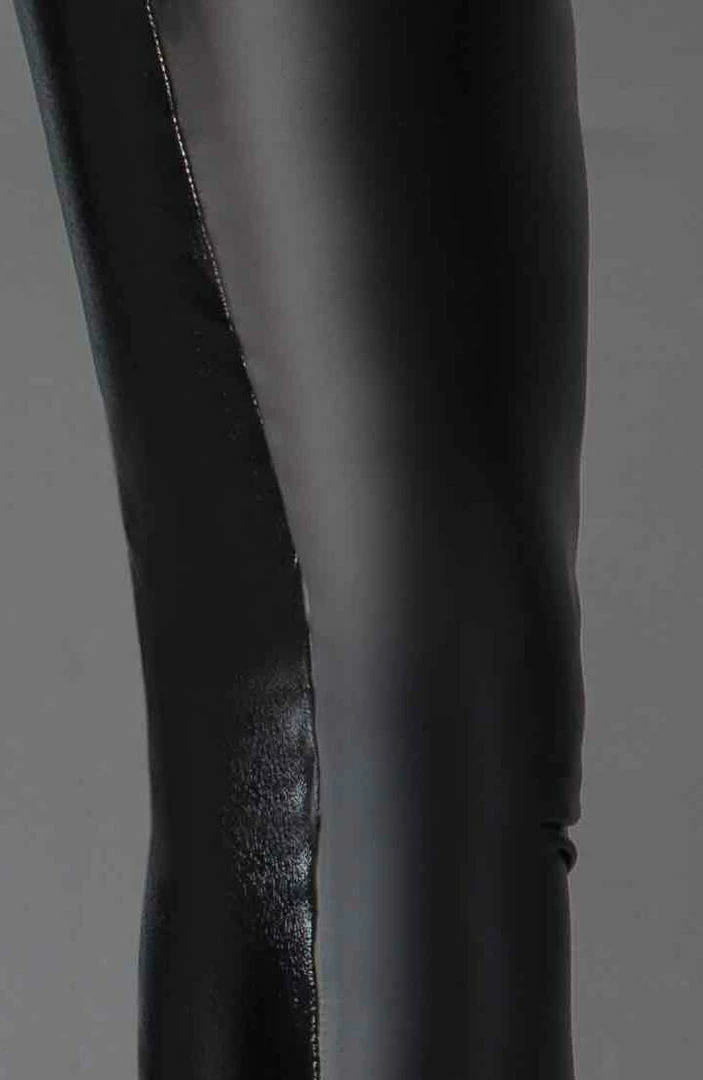 Exclusive black thigh high footless stockings. The stockings are handmade in the stylish matte power wet look material on the inside and lacquered faux eco leather exterior.
