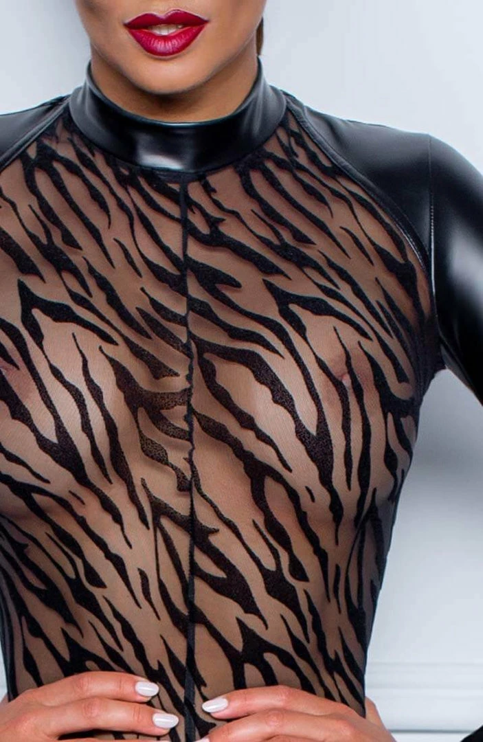 Wet look catsuit with flock tiger print