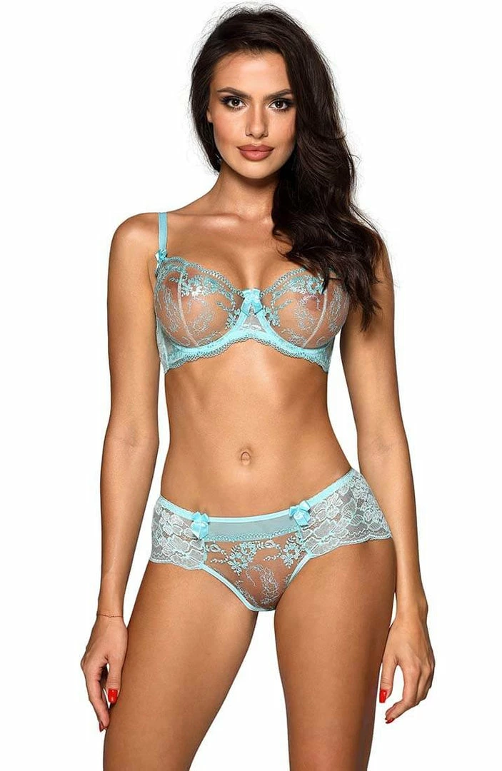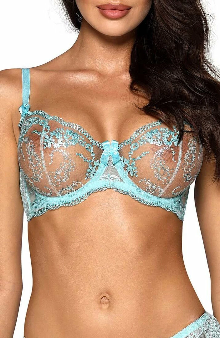 Slip into something sexier like this stunning sheer turquoise bra featuring a beautiful glossy embroidery, cute turquoise satin bows, a shiny front jewel, eye-hook closure and adjustable shoulder sttraps.