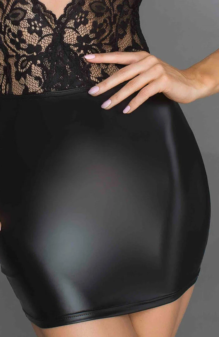Seductive black mini dress with a feminine lace top and bottom in exclusive power wet look material.