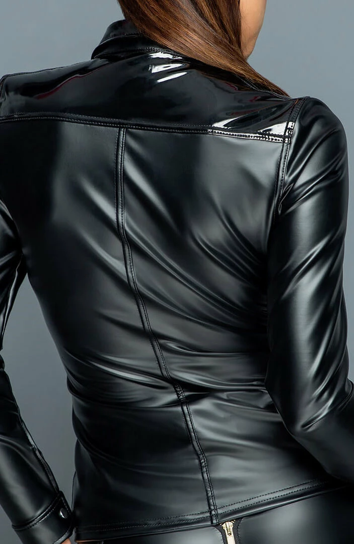 Black long sleeve shirt in an erotic mix of wet look and PVC materials. The push-button cuffs allow the sleeves to be easily rolled up.