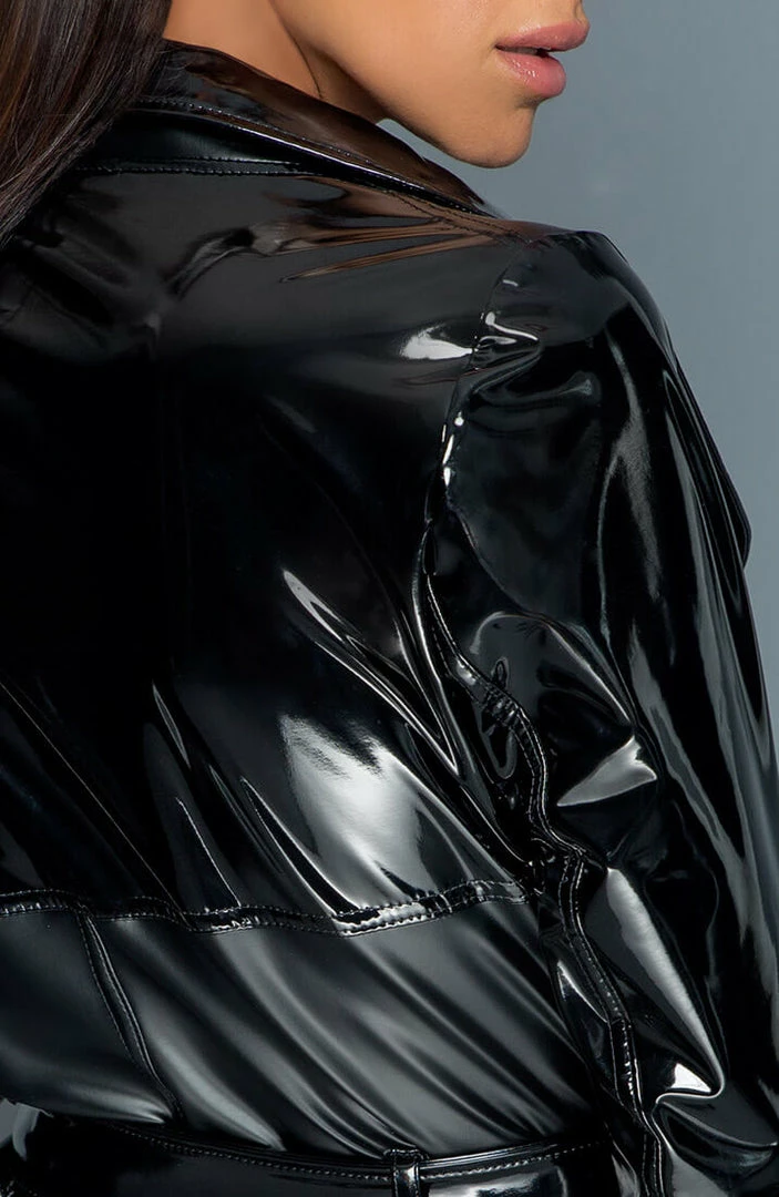 The figure tailored trench coat has a matte power wet look base with black glossy PVC sleeves and a matching PVC belt, offering you a daring and sophisticated look.