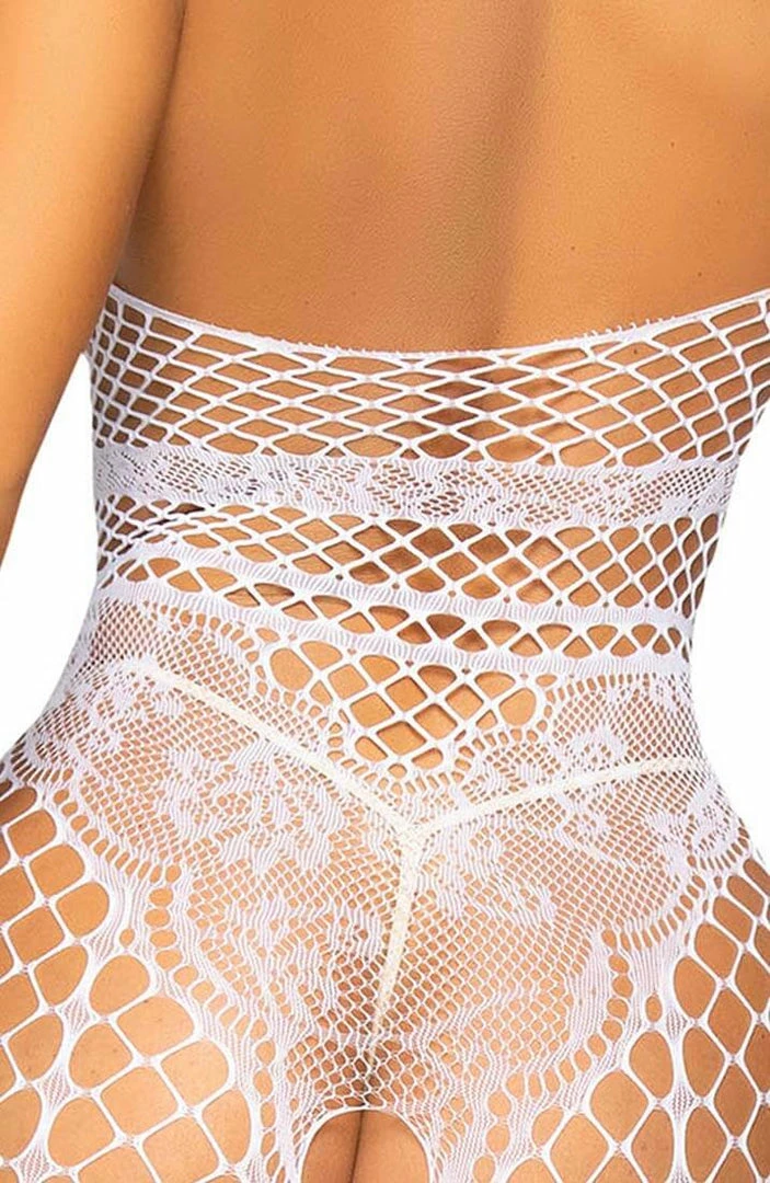 Accentuate your sexiest assets in this sexy white crotchless bodystocking featuring a halter neck design, sheer lace cups, a sheer mesh bodice with an industrial netted center panel, a netted mesh garter and suspender look.