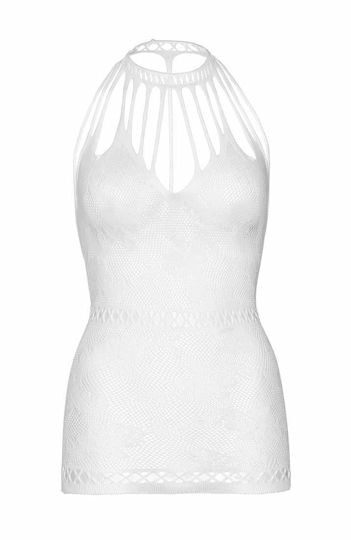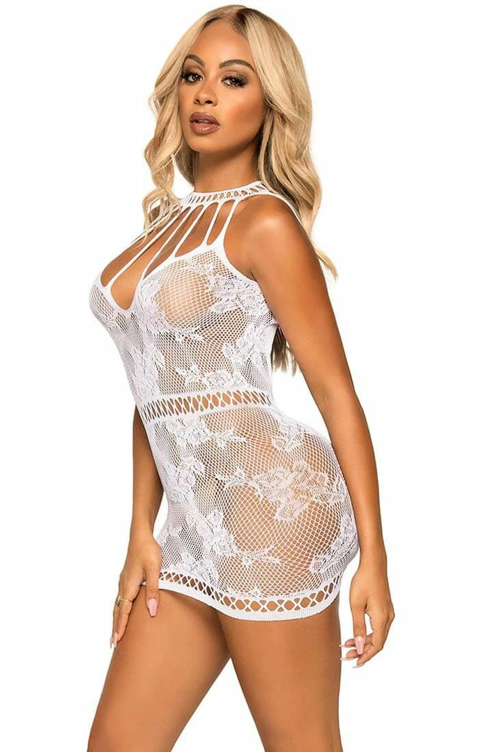 Give your babe a taste of your curves in this sexy white lingerie dress featuring an extremely stretchable fishnet material with feminine floral lace pattern, strappy cut-out neckline and a seductive cut-out low back design.