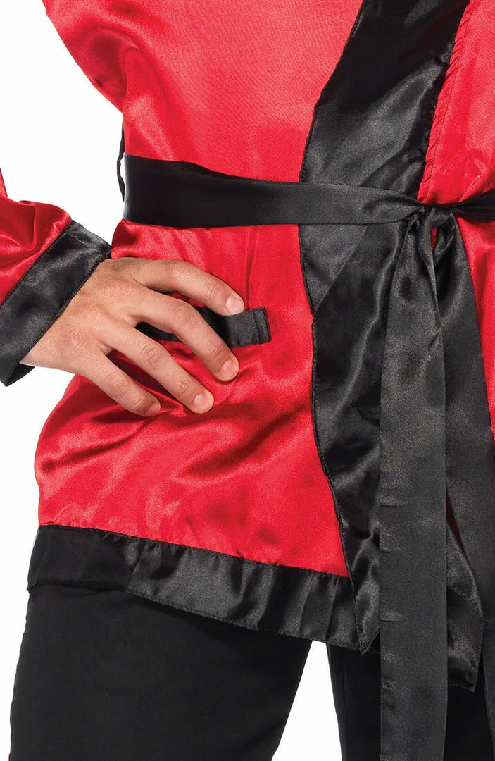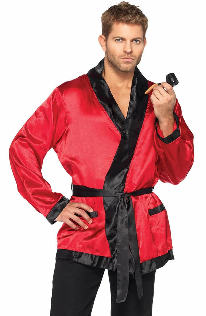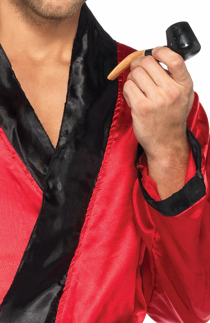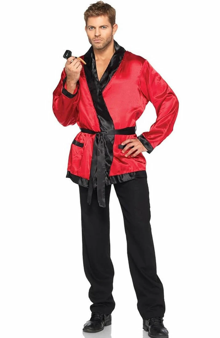 It doesn’t get any better then this bachelor Hugh Hefner costume featuring the iconic red satin smoking jacket with black trim and a belted tie at the waist.