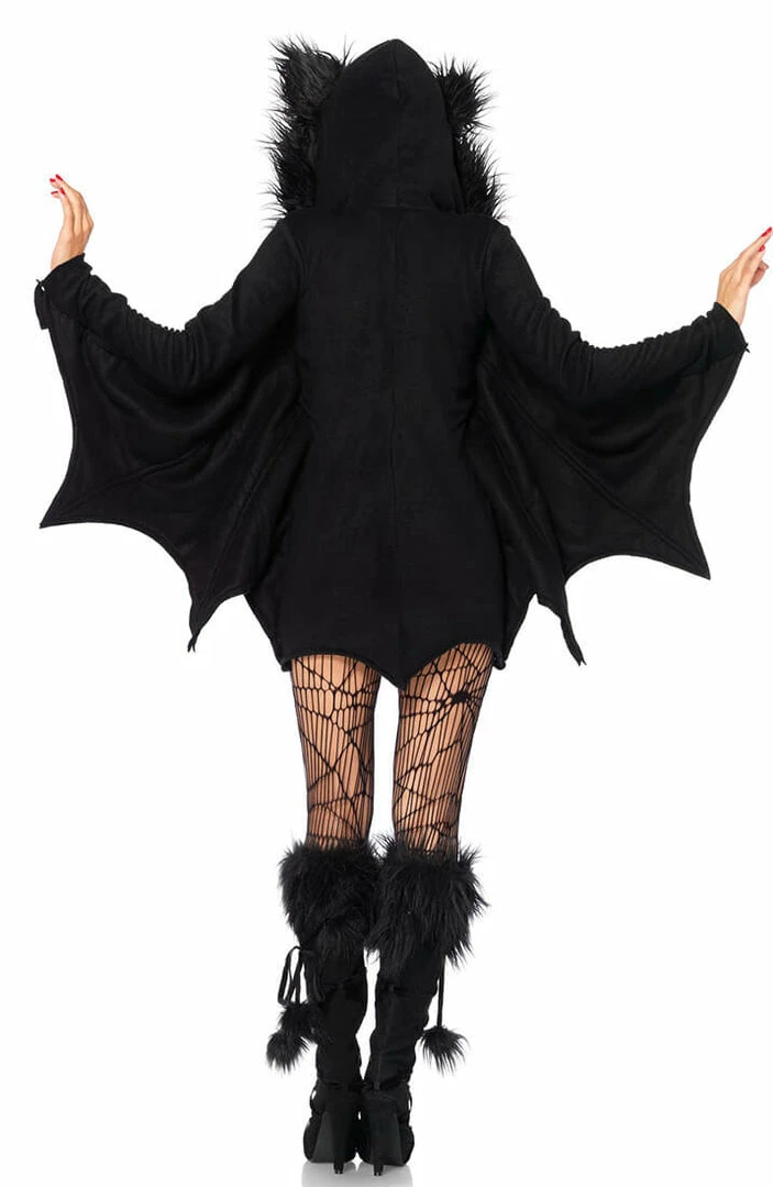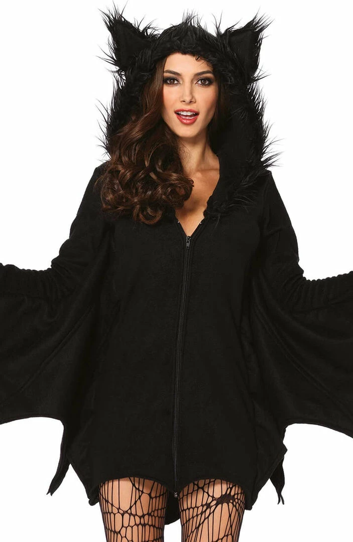 The Halloween bat costume features a comfortable, cute and warm black fleece hoodie dress with a front zip closure and small fluffy ears.