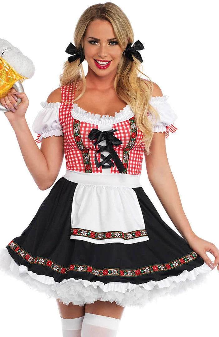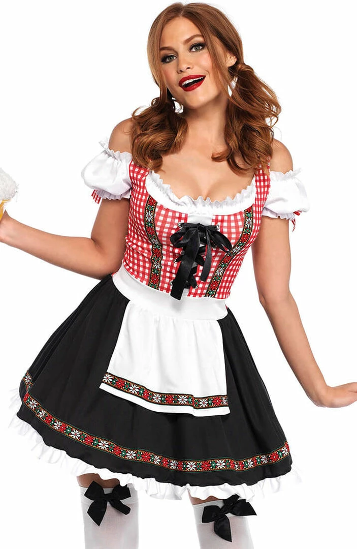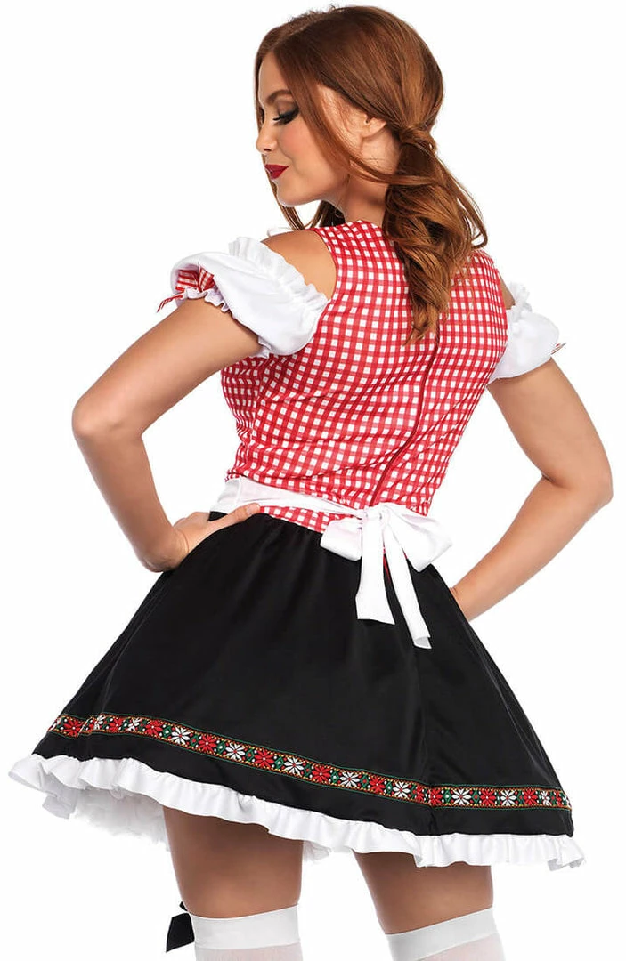 Cute, sexy and feminine beer girl costume in the classic black, white and red colours. The dress is decorated with many classic details such as the red/white checkered top part with black corset lace-up at the front, the cutest embroidery trim, small puff sleeves and a white apron.