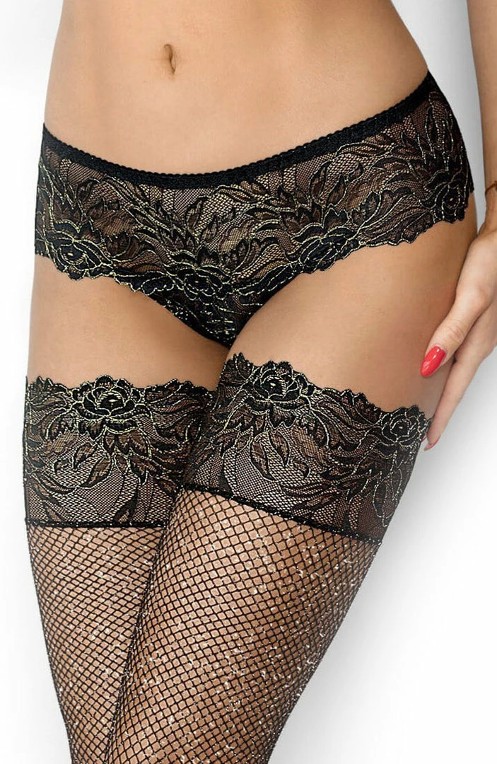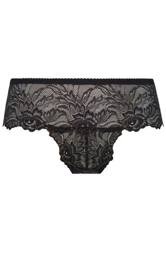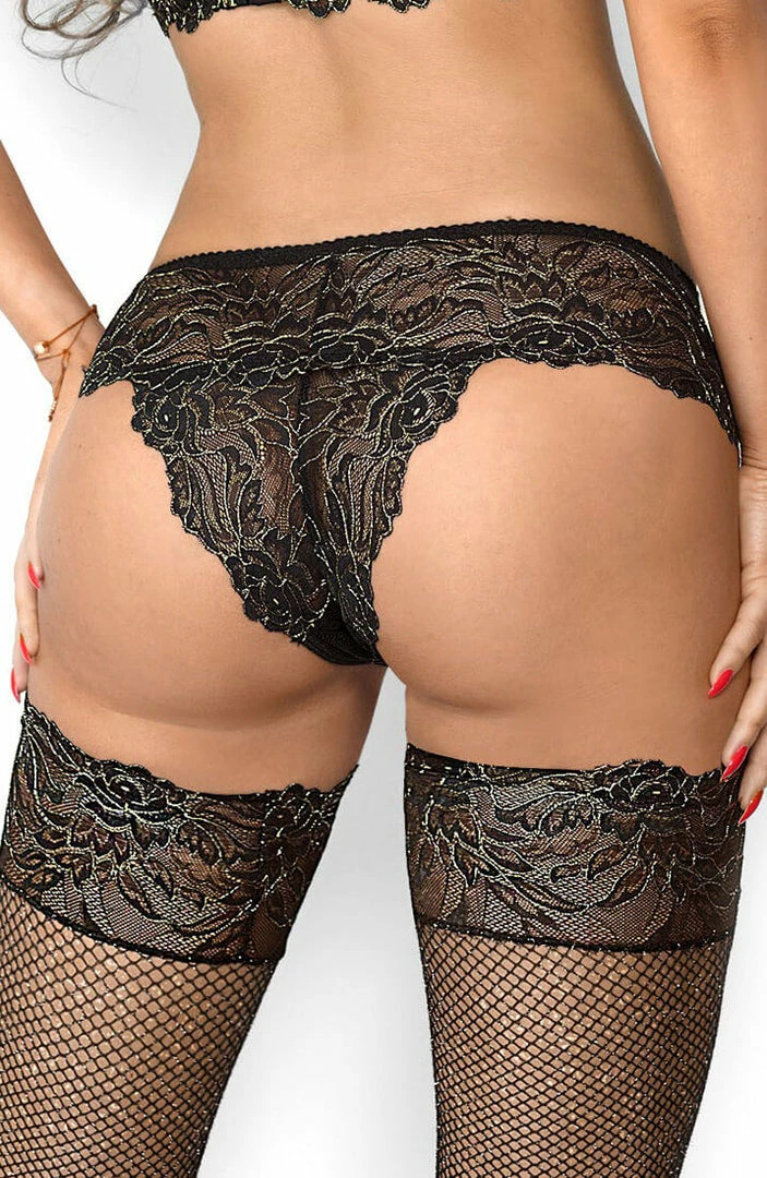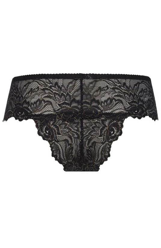Sexy black brazilian panty in beautiful lace with gold shimmer.