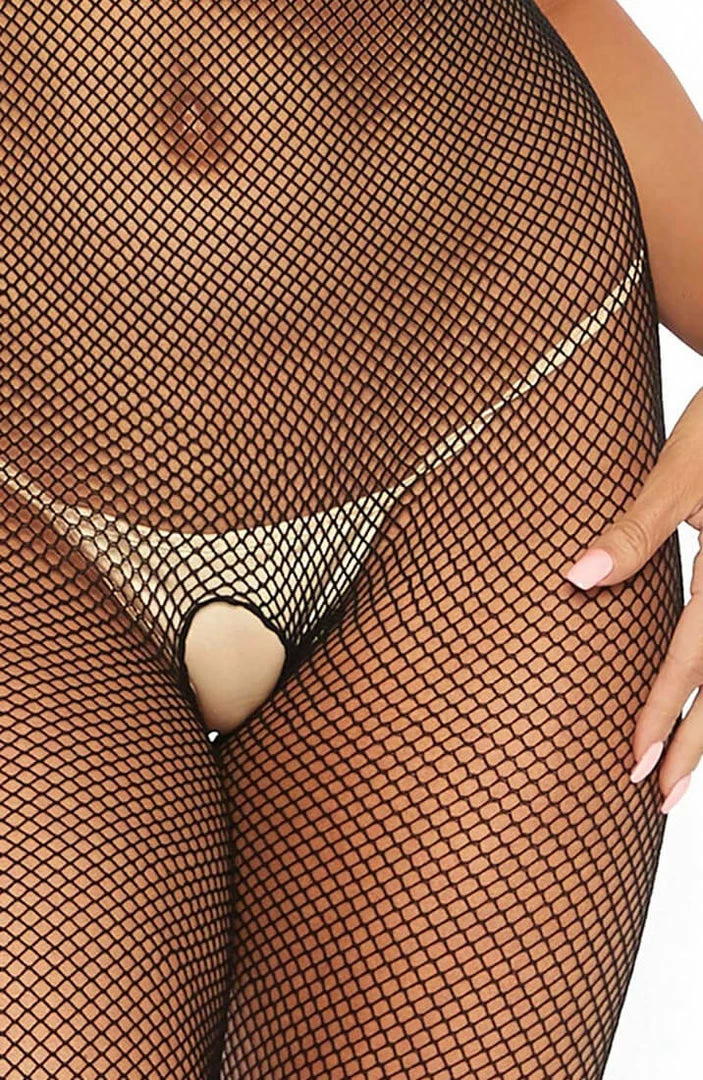 Black crotchless bodystocking with a delicate lace halterneck and a seductive deep open back. The bodystocking is made in incredibly soft and extremely stretchable fishnet material.