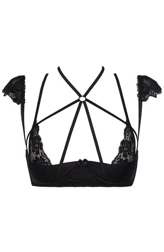 Show him love isn’t blind with this erotic black shelf bra featuring a beautiful black lace overlay that covers the bust, a seductive cage-strap design, halter neck and detachable shoulder straps for maximum support.