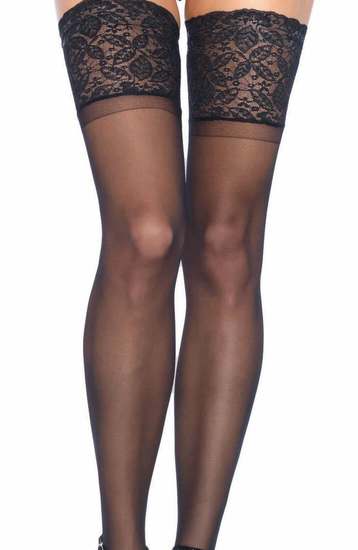 Classic black stay up stockings in nylon with a beautiful 5 inch silicone lace top.
