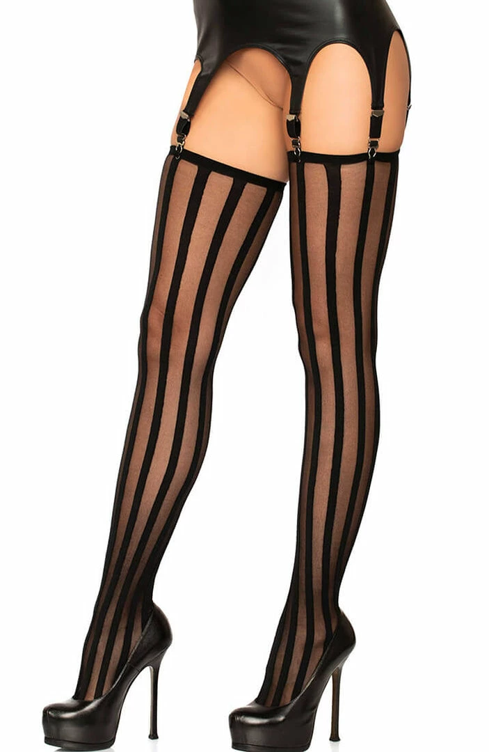 Beautiful black thigh high stockings in nylon with black vertical stripes.