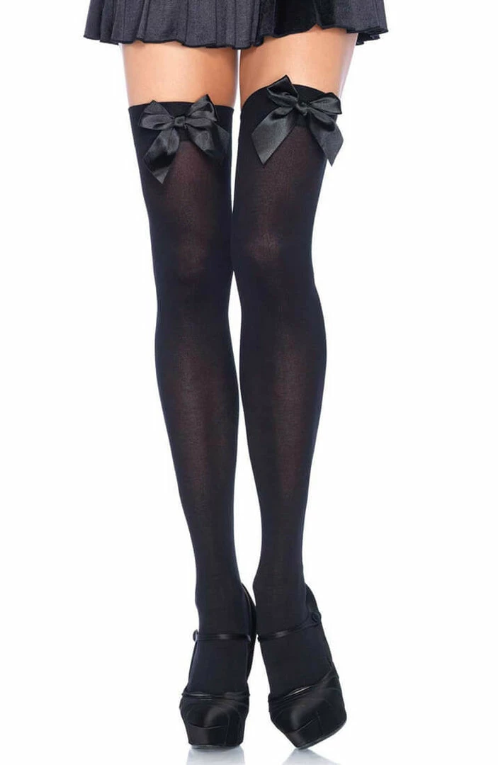 These flirty black thigh high stockings feature a solid elastic top with black satin bow accents.