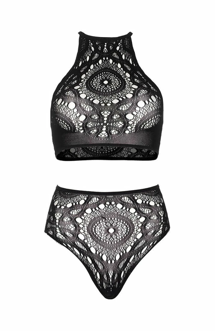 Black top and high waisted thong in an incredibly stretchable cut-out crochet lace. The top has an elegant back with thin cage-straps.