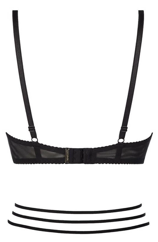 Dare to bare some skin in this erotic black wet look bra featuring moulded shelf cups, an embroidered lace harness and framing waist cage-straps.