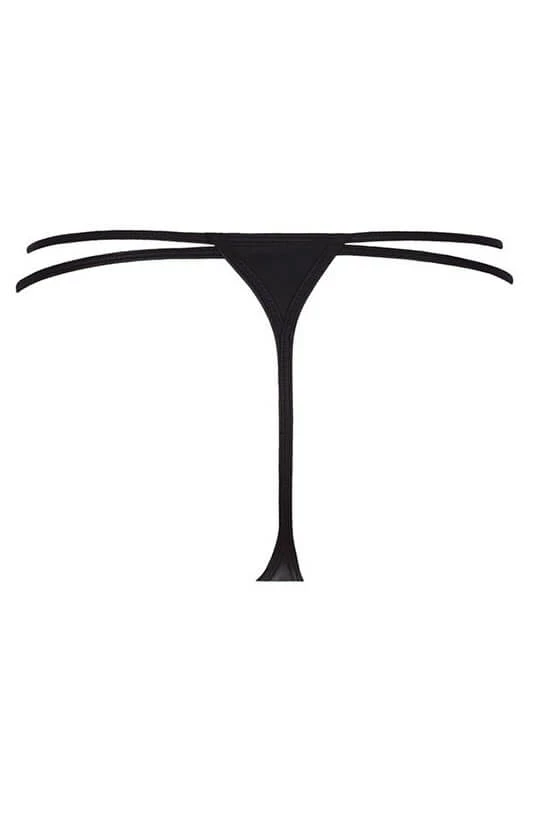 Erotic black wet look thong with a sensual cage-strap back.