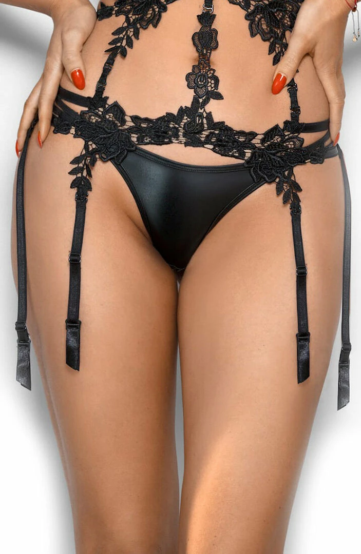 The APHRODISIAC lingerie set consists of this wet look thong, a wet look push-up bra and a stunning black lace harness – all of which are sold separately.