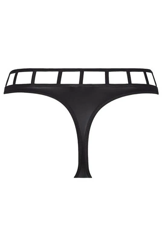 Sexy black wet look thong with a wide trim of cut-out squares.