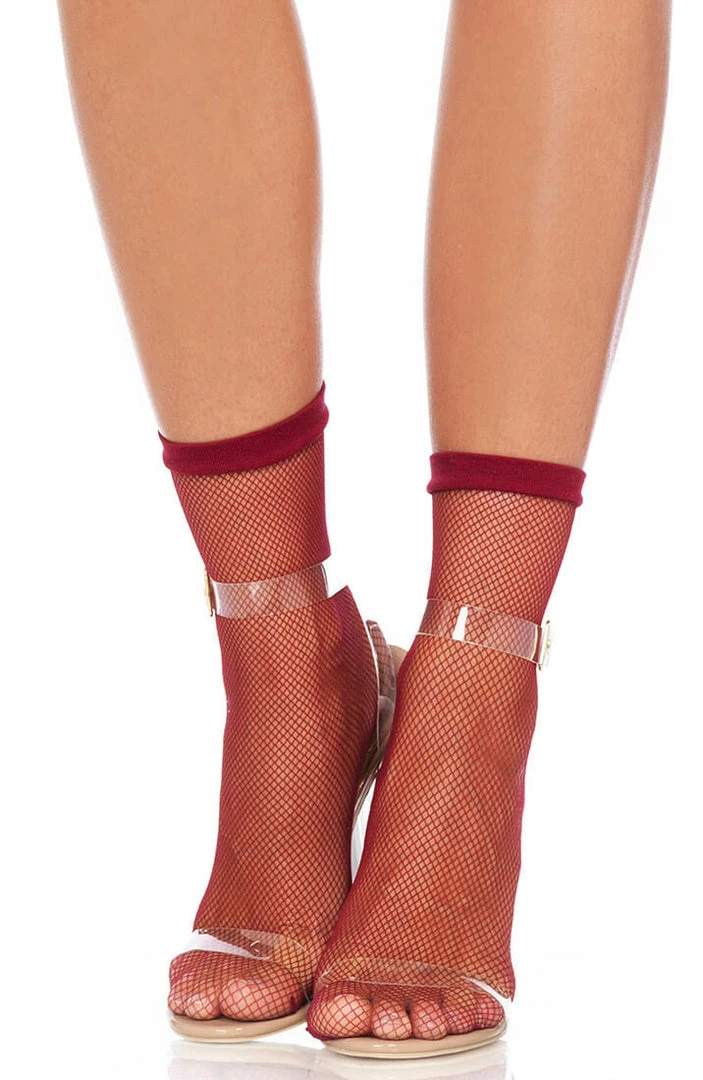 Cool and stylish burgundy fishnet ankle highs with a thin opaque nylon top.