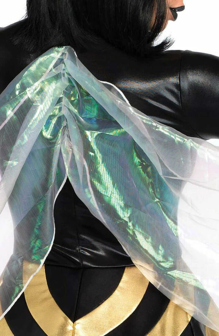 The back also has matching gold stripes and a foam stinger. The transparent wings are attached to the back and sleeves.