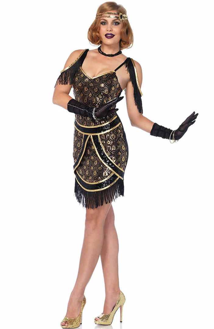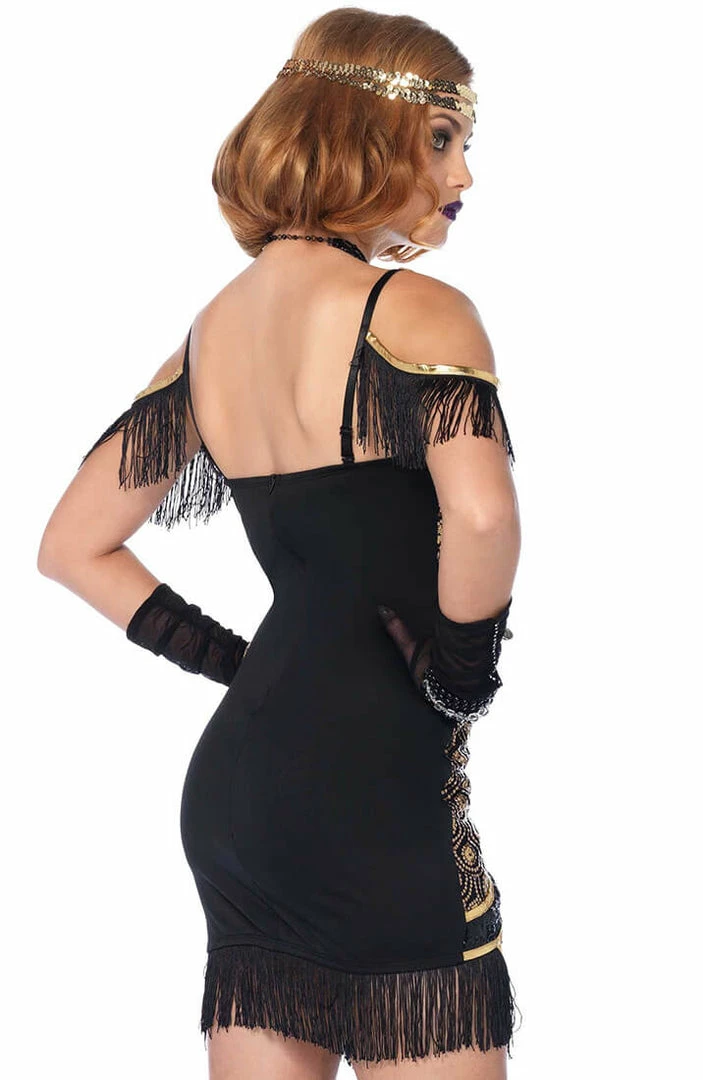 The costume features a beautiful glittering dress decorated with black and gold coloured sequins from top to bottom and thin delicate fringes on the shoulders.