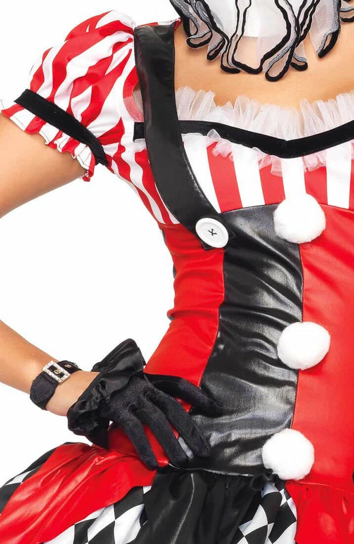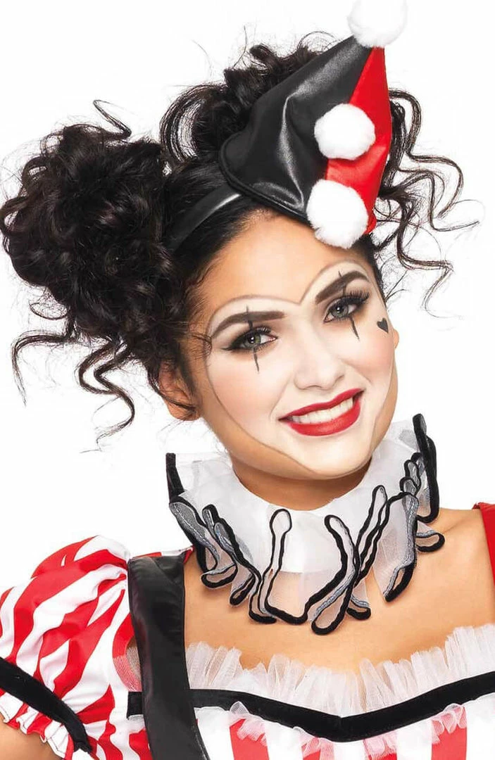 The dress is produced in stretchable polyester and has a wet look front piece. The costume includes a white transparent clown collar and a head band with a clown hat.