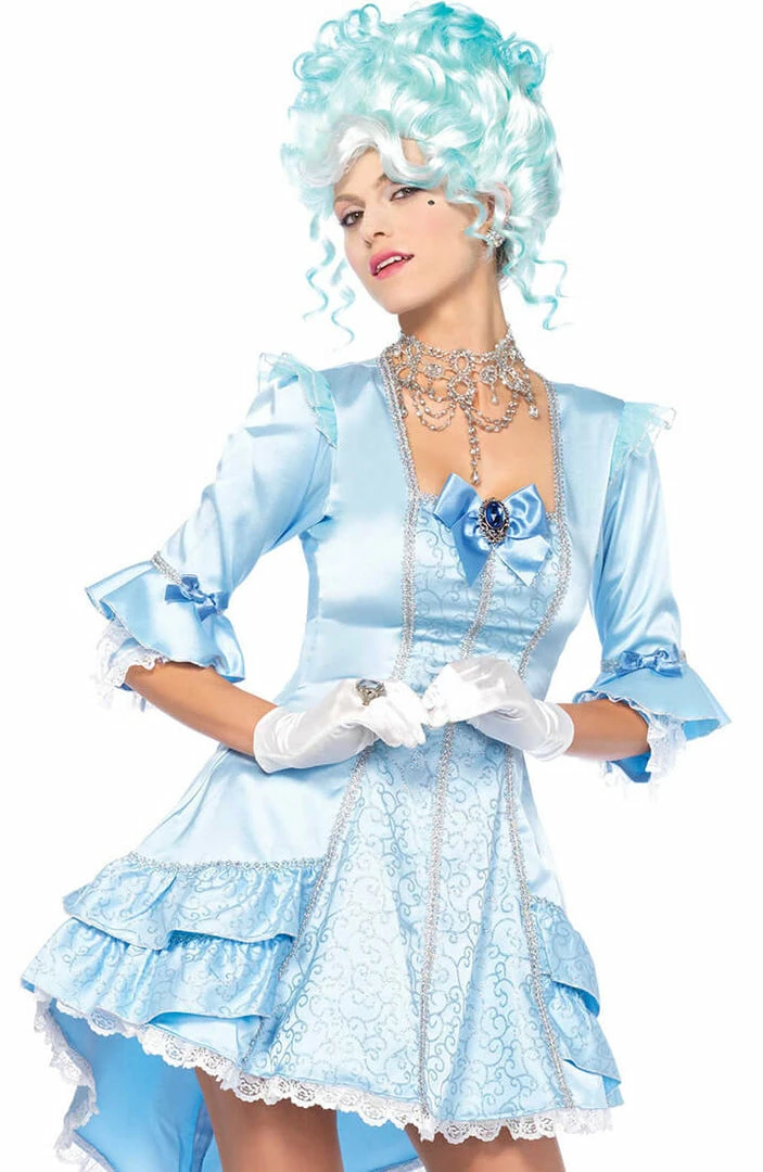 The most amazing authentic masquerade costume in true 17th century style. The costume features a classic and elegant baby blue dress with the most delicate silver coloured ribbon and pattern.