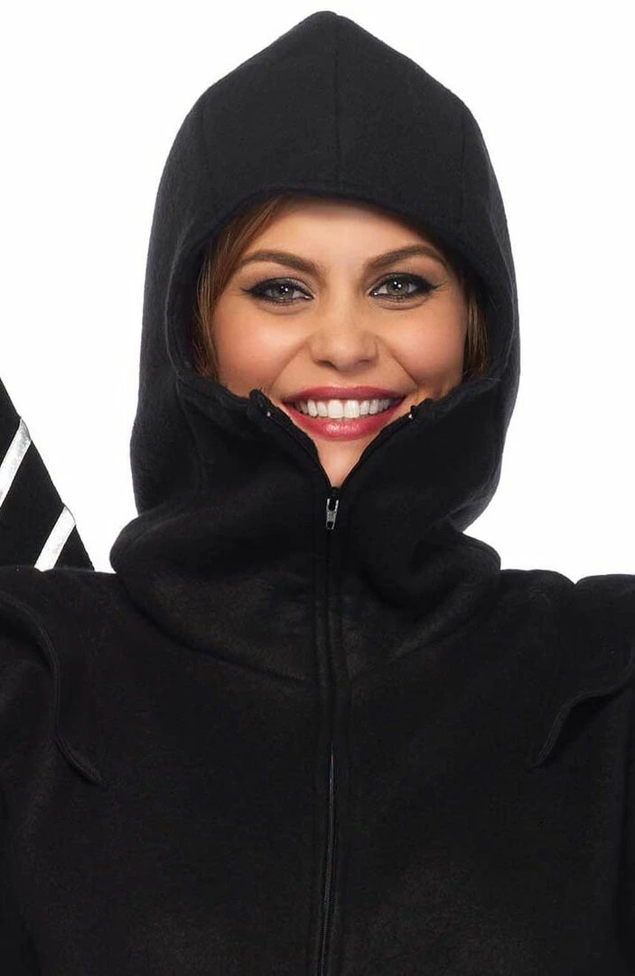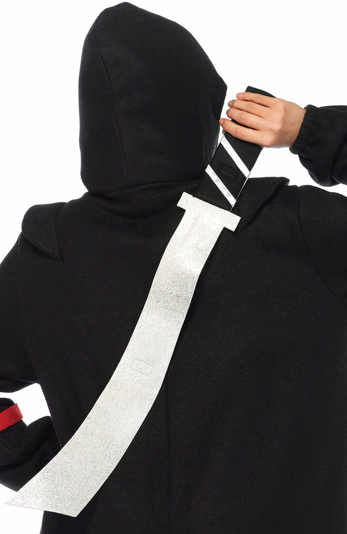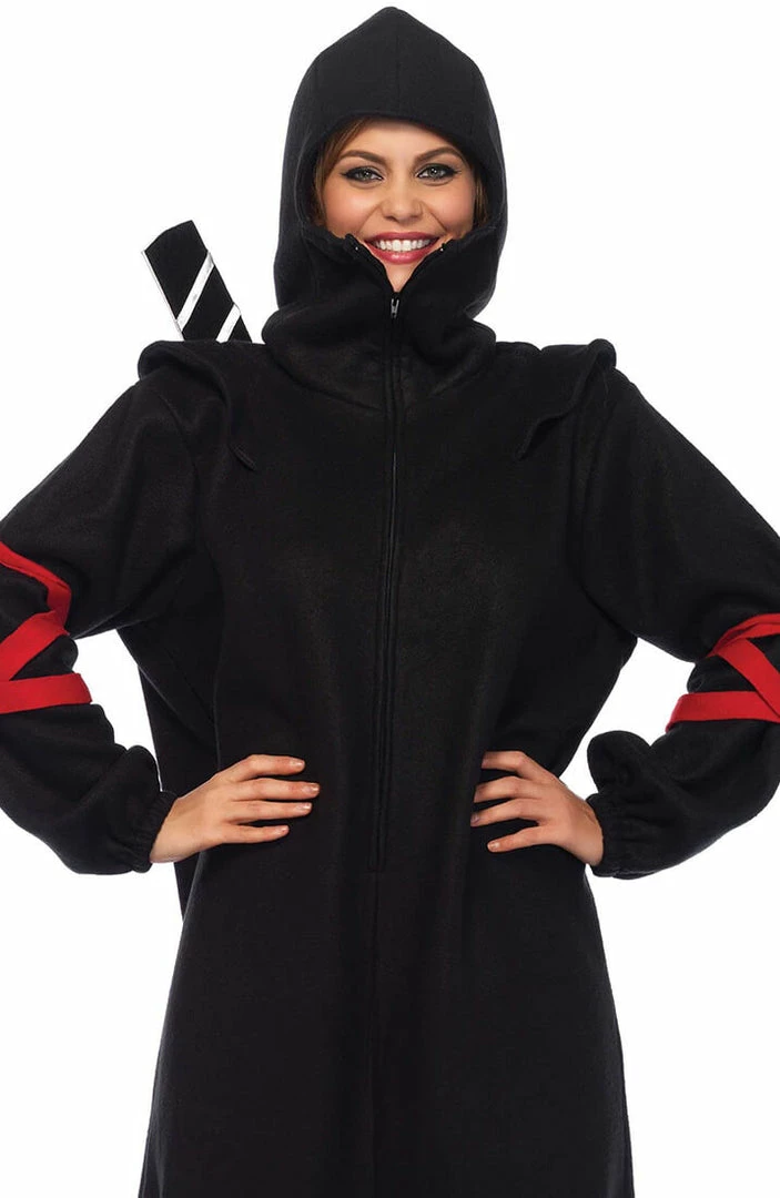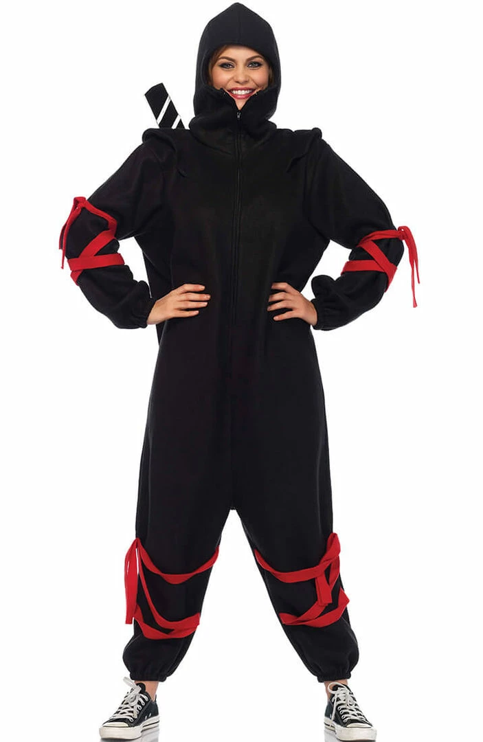 Cool and comfy ninja costume featuring a black cozy onesie with hood, in an oversized design and with attached red wrap around straps.