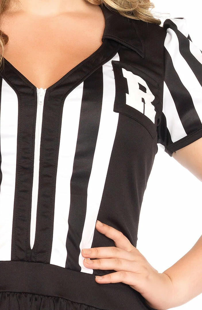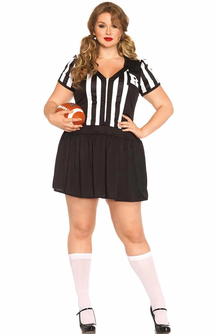 Sporty plus size referee costume featuring a dress with short sleeves in black and white stripes at the top and a black pleated lower part.