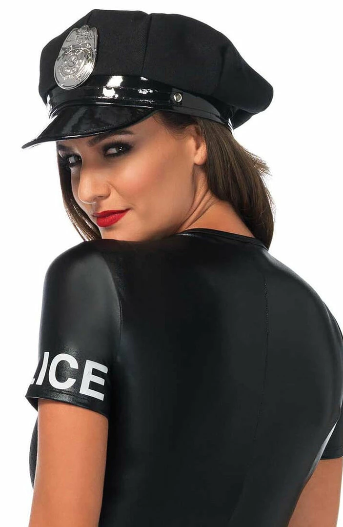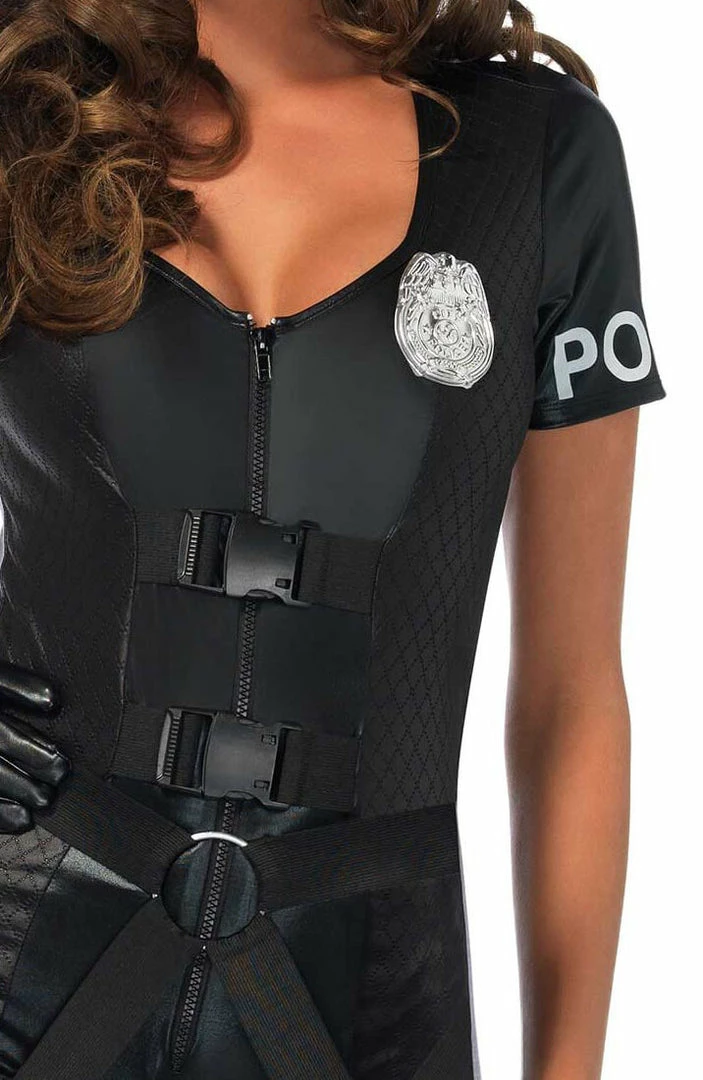 Black police costume Flirty Five-0 Cop featuring a black bodytight romper with zip, in a comfortable spandex and nylon material.
