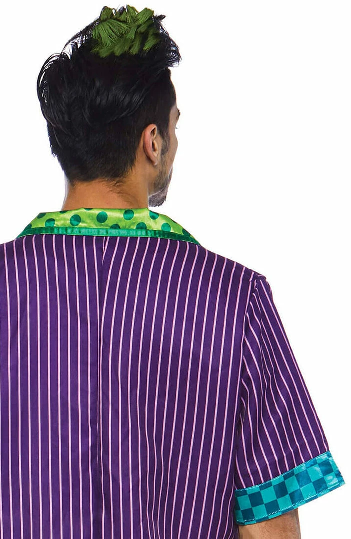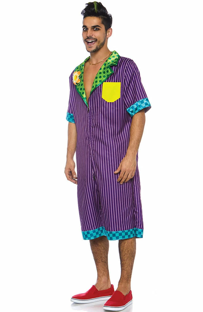 Fun and comfy purple boilersuit with at zip at the front. The boilersuit is decorated with a green and blue trim, a flower and a yellow pocket in the iconic Joker look.