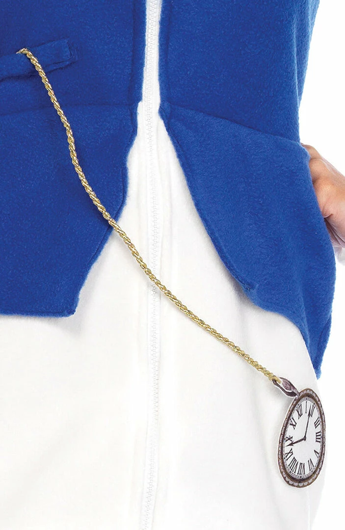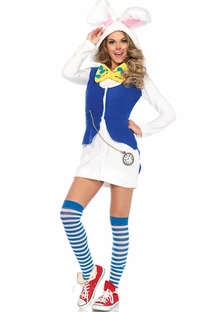 The costume features a long white hoodie in fleece material with a zip at the front. The dress has an attached blue vest with attached velcro body pocket watch, a hood with oversized rabbit ears in faux fur and an oversized yellow bow tie.