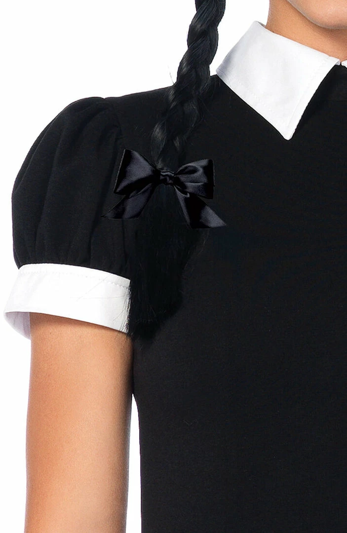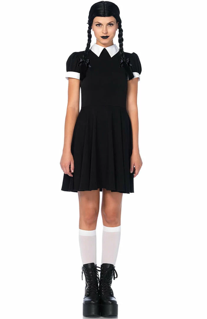 Take the Halloween costume to new hights with The Adams family’s Wedneday Darling. The costume feautures a cute innocent black dress with white sleeve trim and a white collar. The dress is closed with a discreet zip at the back.