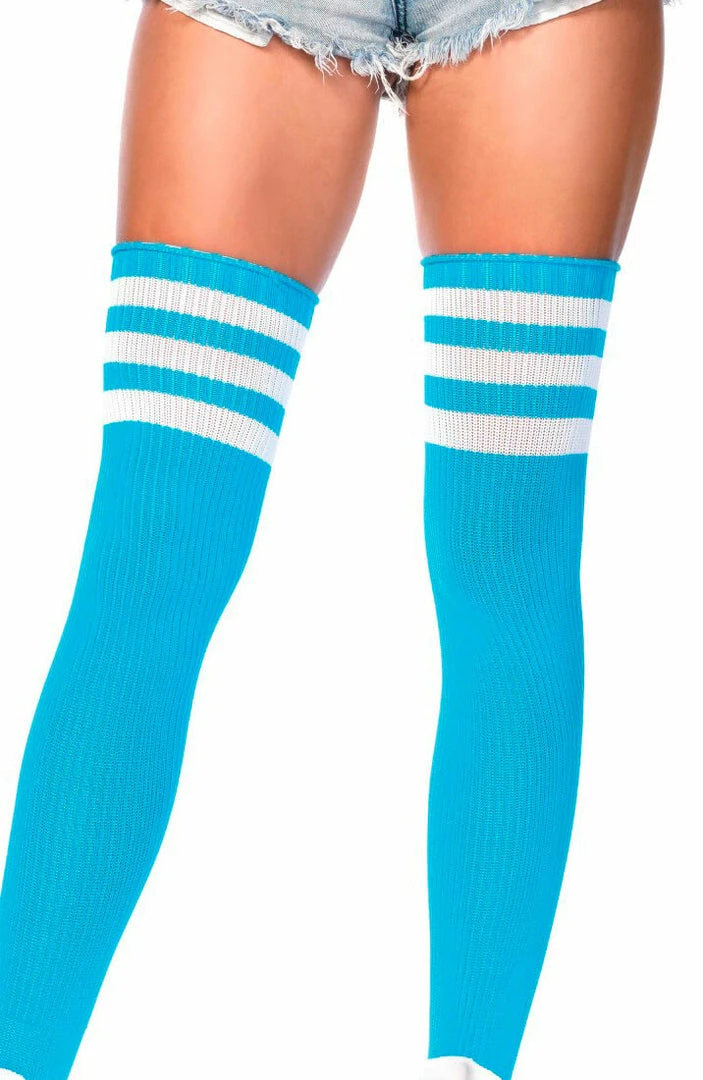 Neon blue Athletic ribbed thigh high stockings feature a triple white striped contrast top.