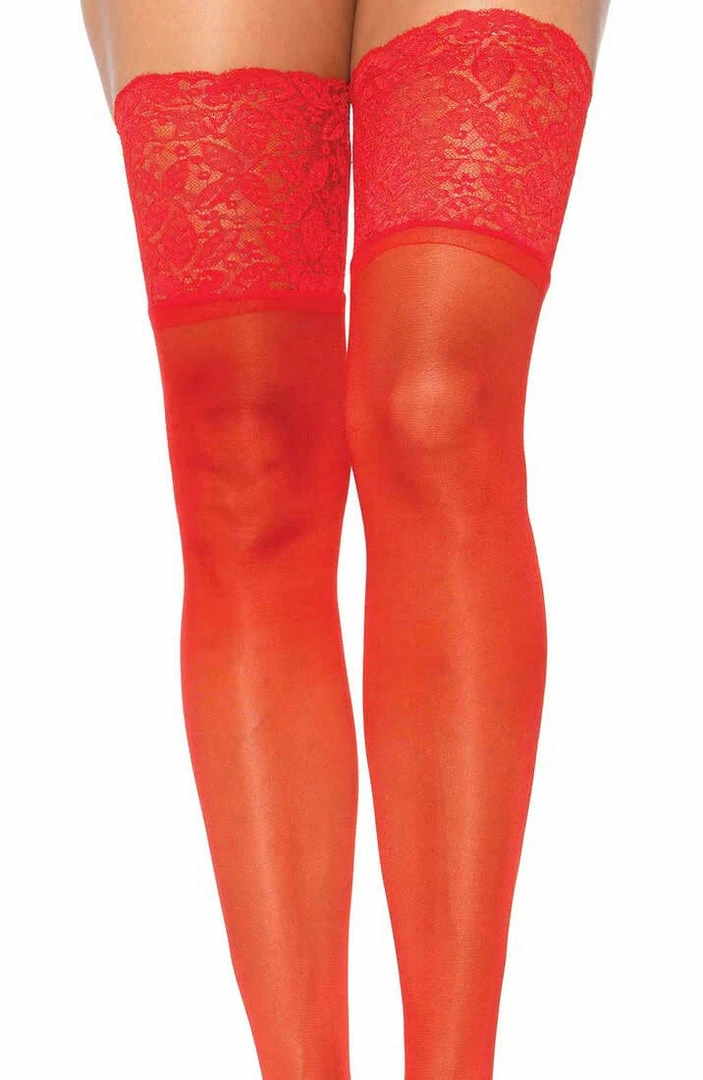 Classic red stay up stockings in nylon with a beautiful 5 inch silicone lace top.