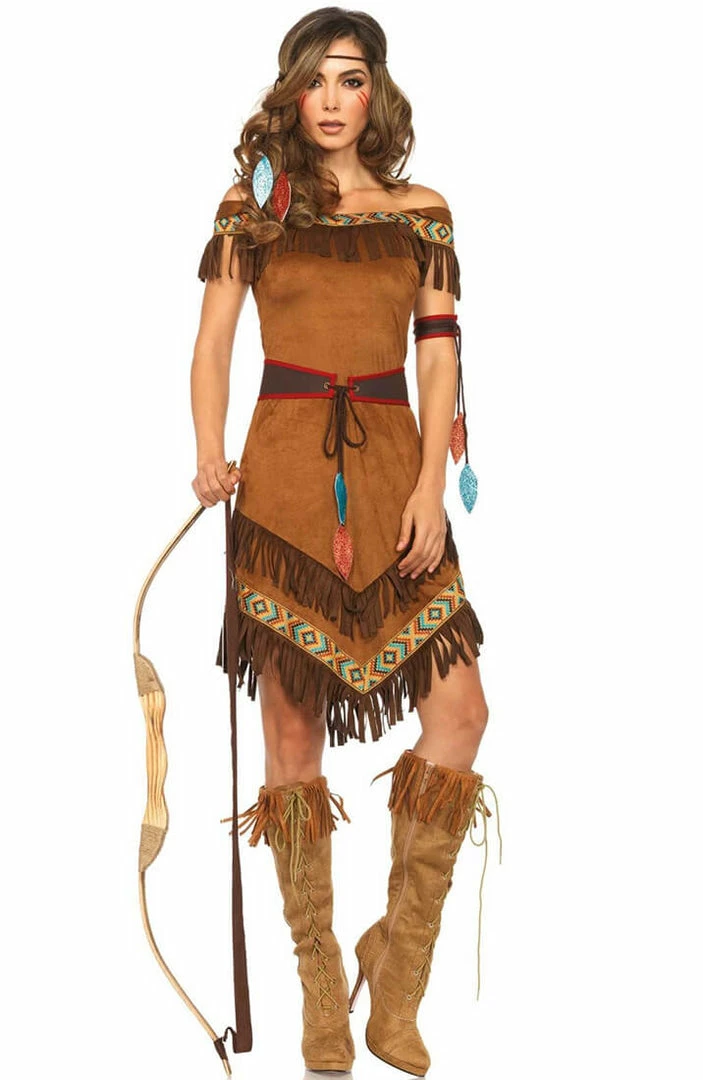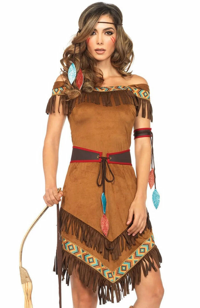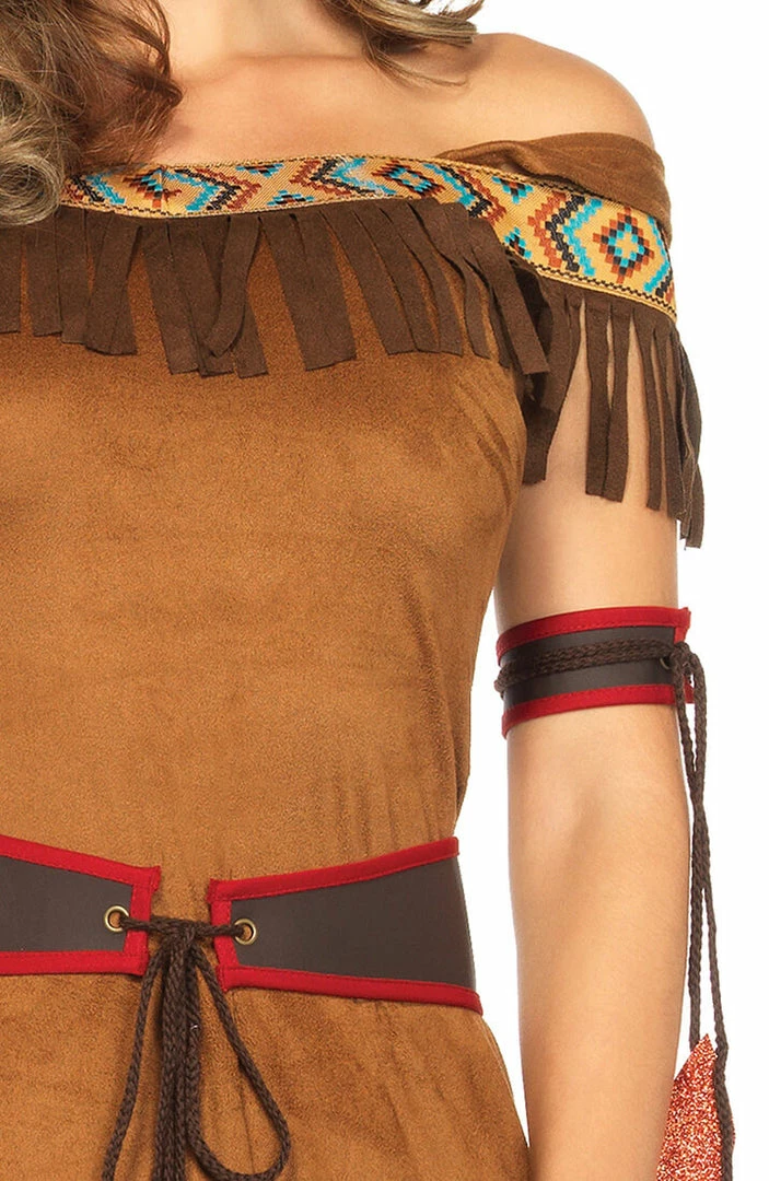 The native Indian costume Native Princess features a brown dress with fringe accents and ribbon trim, belt with leaf tie details and arm and headband in true native Indian style.
