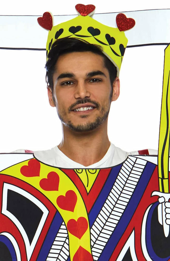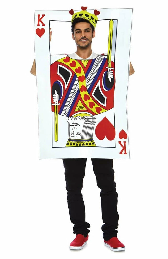 The King of Hearts costume features a large foam playing card with the King of Hearts print at the front. The card has a cut-out at the top part which frames your face as the King of Hearts!