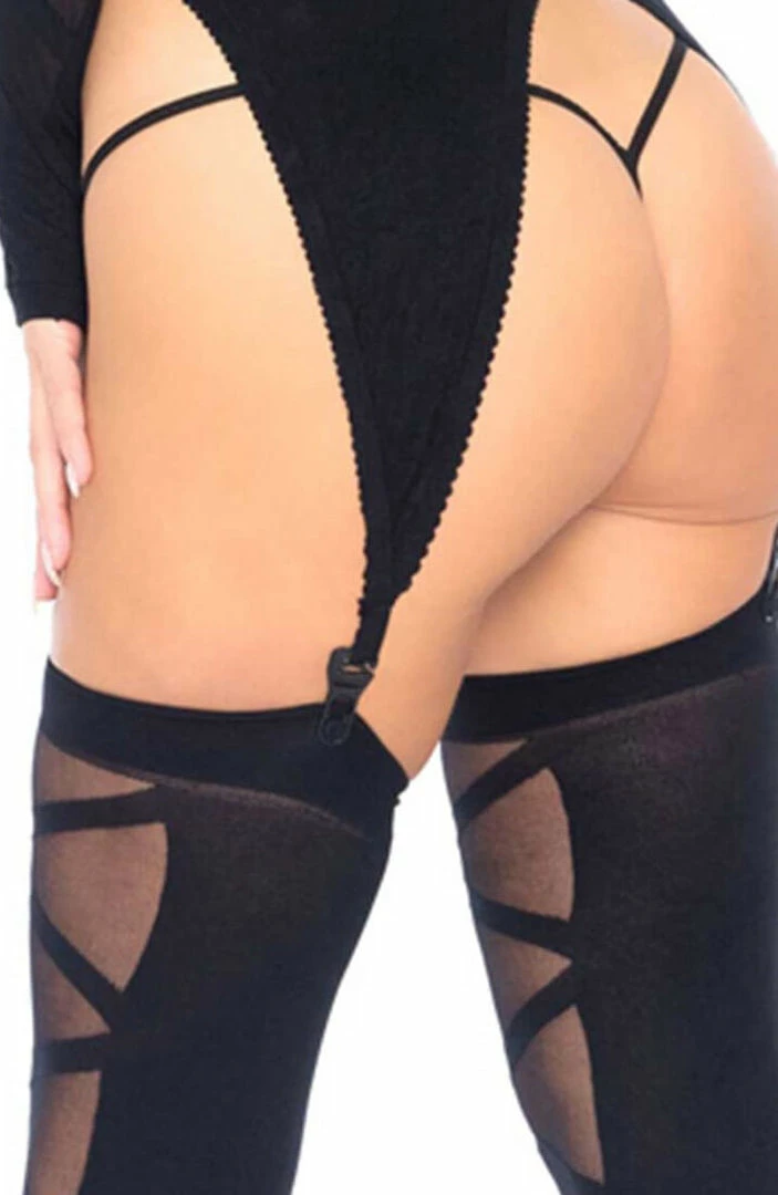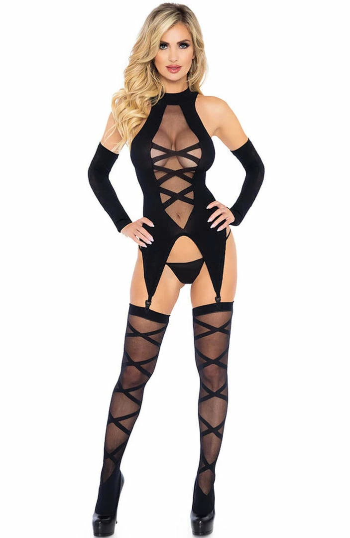 The bodystocking features 3 pieces, all of which are partial transparent and with a criss-cross pattern that gives the feeling of a suggestive lace-up.