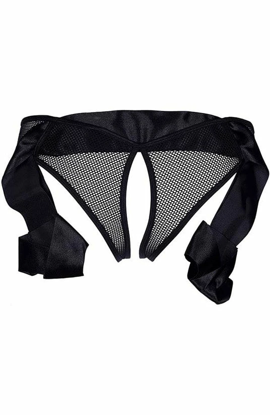 Sexy and seductive black crotchless knickers in sheer netted material with lace. The knickers are open on both sides to run the erotic black satin ribbon through.