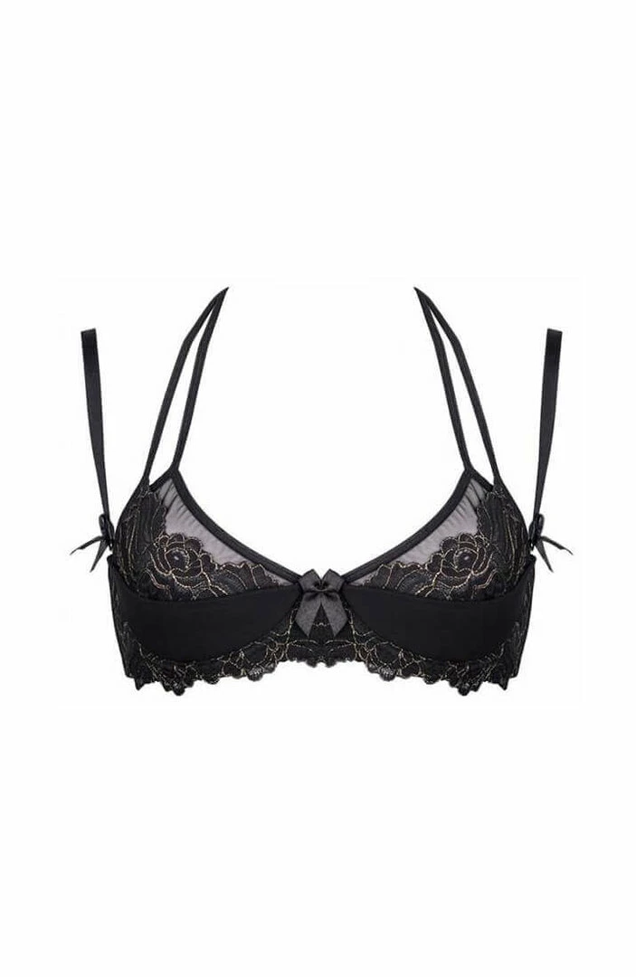 Black plus size bra with shelf cup and transparent overlay across the bust. The bra is decorated with a delicate lace and gold shimmer.